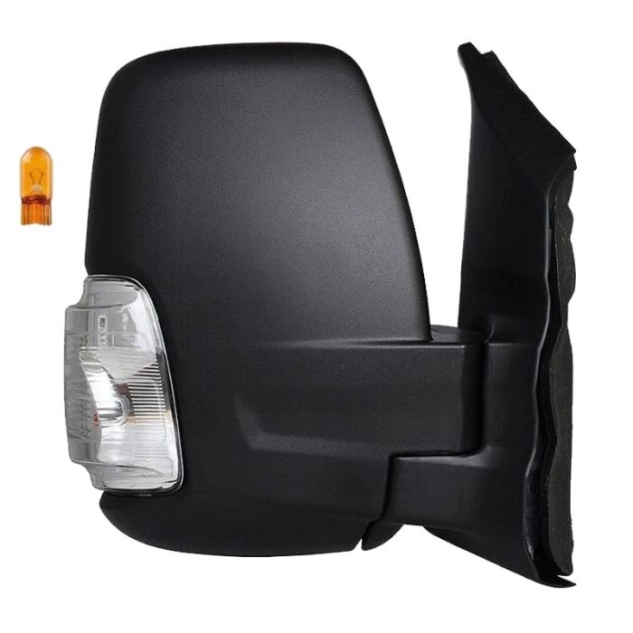 Pravé zpětné zrcátko Ford Transit V363 (FAD/FBD/FCD/FDD) od r.v. 10/2019 - , manuálně ovládané, černé, vypouklé sklo, s blikačem (žárovka 5W), krátké, 2 pinový konektor.